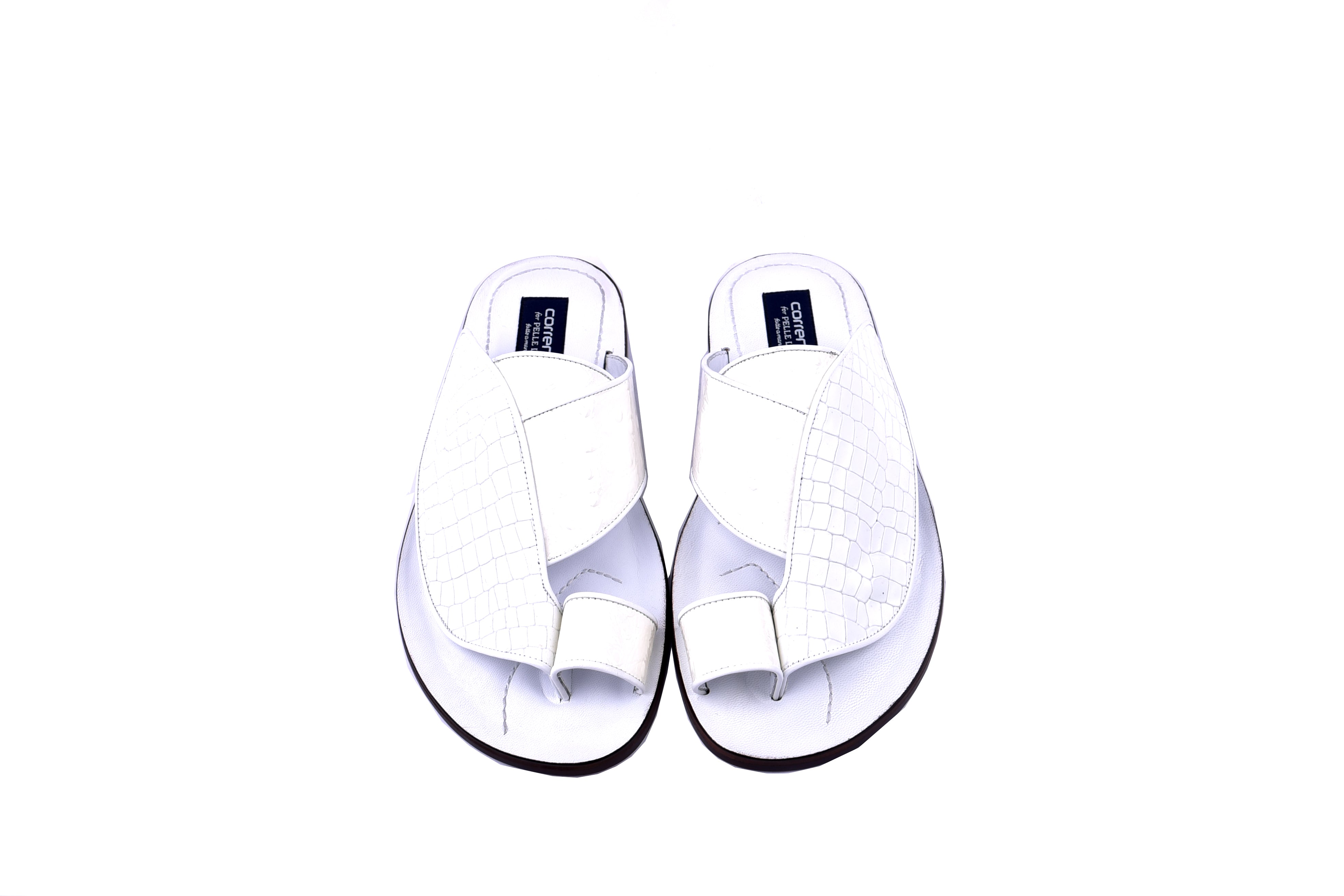 Elevate your style with our luxurious Croco print ring toe sandal. Made with high-quality materials, this sandal exudes sophistication and class. Featuring a unique crocodile print design and an elegant ring toe detail, it's the perfect addition to your wardrobe. Available in elegant white color. Treat yourself to this exclusive piece now.