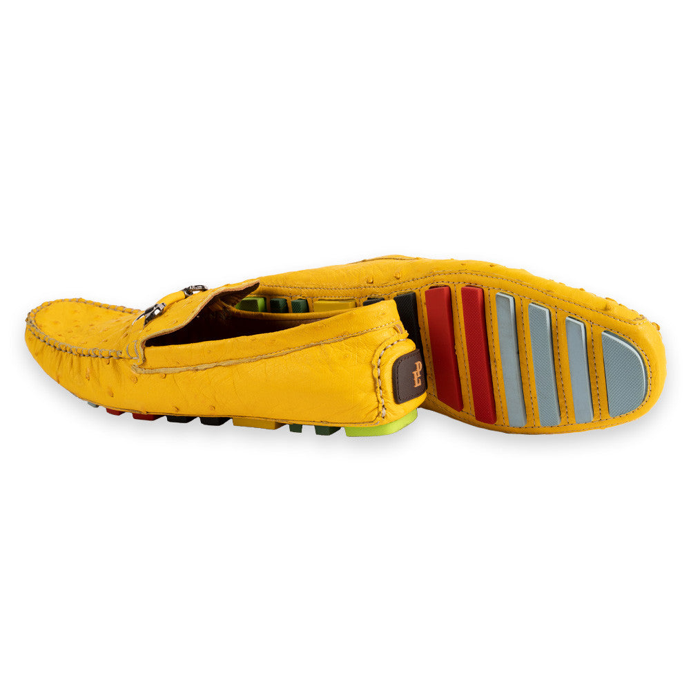 Take luxury to the road with our P014093 - Palm Beach Genuine Ostrich Driver in yellow. Handcrafted with genuine ostrich leather, this driving shoe exudes sophistication and exclusivity. Experience the smooth, supple feel of genuine ostrich as you glide along the road. Elevate your driving experience with this premium shoe.